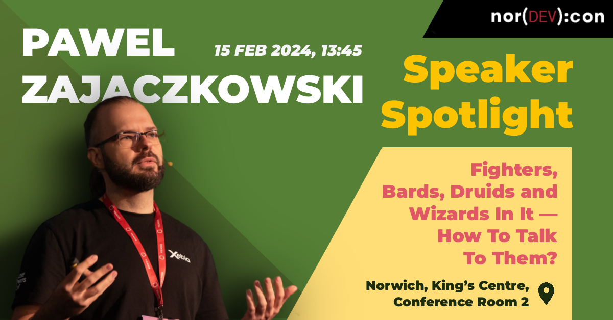 Pawel: Possibly expect lots of references to pop culture characters that I've snuck into the talk to exemplify the four main personality types we can encounter in software development. Also: fantasy-themed visuals!